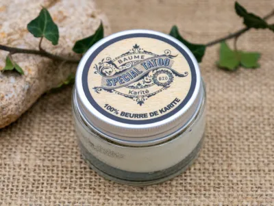 Véritable soin ultra concentré 100% PUR Beurre de Karité BIO et équitable. SANS PARFUM Nourrit, hydrate et limite les démangeaisons sur votre peau nouvellement tatouée. Baume de 50ml.