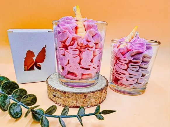 La bougie licorne est une bougie artisanale végétale. Elle apporte un mélange de pêche, framboise et violette. Elle est originale par son visuel coloré et girly.