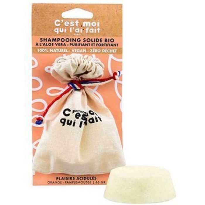 Shampooing solide bio « Plaisirs acidulés » à l’Aloe Véra, fragrance orange et pamplemousse, purifiant et fortifiant. Formule 100% naturelle, vegan et zéro déchet.