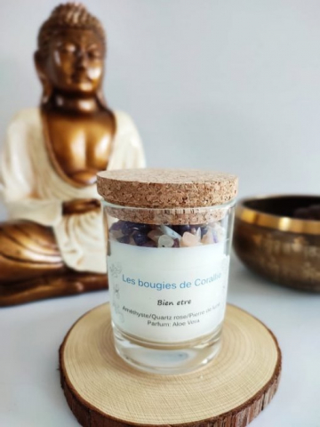 Bougie avec pierres naturelles lithothérapie : Améthyste, quartz rose, pierre de lune