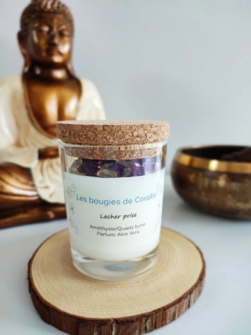 Bougie avec pierres naturelles lithothérapie : Améthyste, quartz fumé