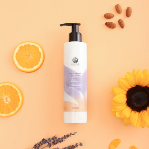 Le lait corporel est un concentré d’huiles végétales BIO de grenade et d’amande douce choisies pour leurs actions nourrissantes et antioxydantes, riches en vitamine E, utile contre le vieillissement cutané. L’extrait de myrtille, riche en acides de fruits, ajouté à l’aloe vera, apportent apaisement et hydratation à la peau pour un effet radieux. La synergie d’huiles essentielles de lavandin et d’orange douce parfume délicatement et offre tous les bienfaits de l’aromathérapie sur le corps.