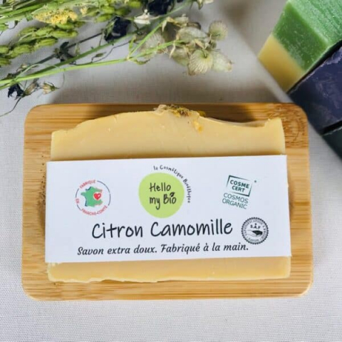 Notre savon citron camomille est saponifié à froid et fabriqué à la main dans notre laboratoire en Franche-Comté. Son parfum doux de citron réhaussé par la camomille vous fera voyager au soleil. Surgras à 10%, il est particulièrement adapté aux peaux sensibles, réactives et à tendance eczémateuse. Notre savon est à lui seul un véritable soin corporel.